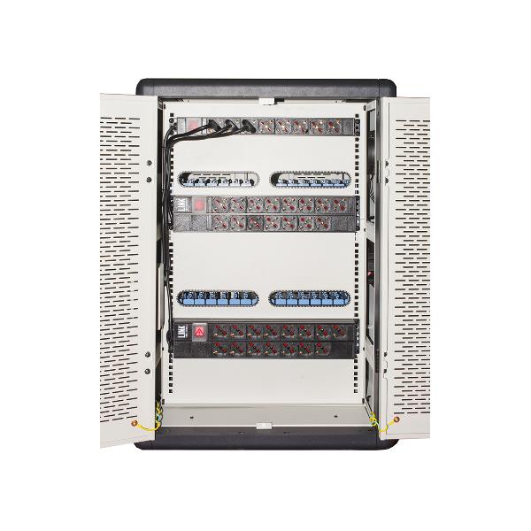 LINK - ARMADIO ALLOGGIAMENTO 30 TABLET CON RUOTE MULTIPRESE INCLUSE VENTOLE DI RAFFREDDAMENTO PORTA IN ACCIAIO TRAFORATA COLORE GRIGIO NERO