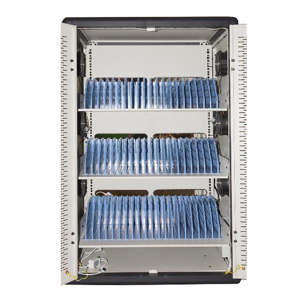 Con tre ripiani con 20 alloggiamenti per notebook o tablet ognuno.